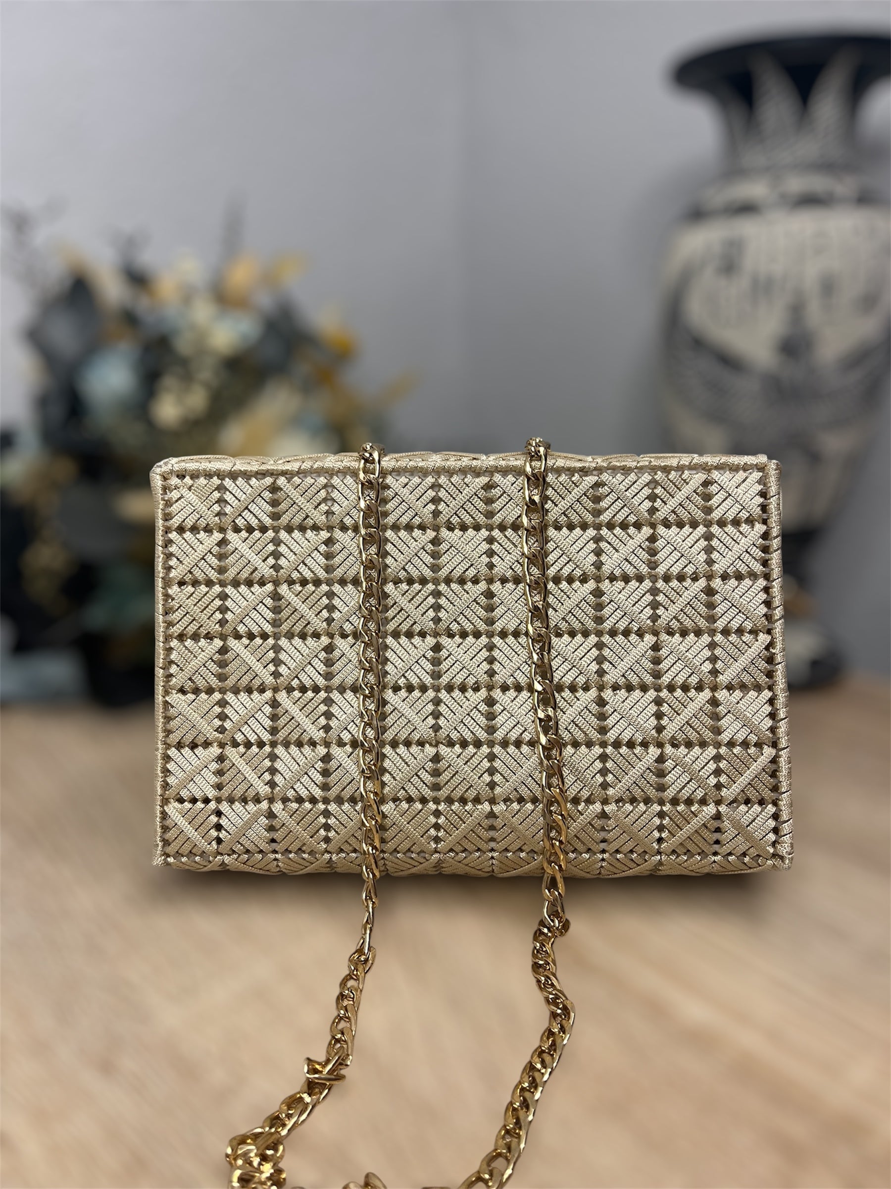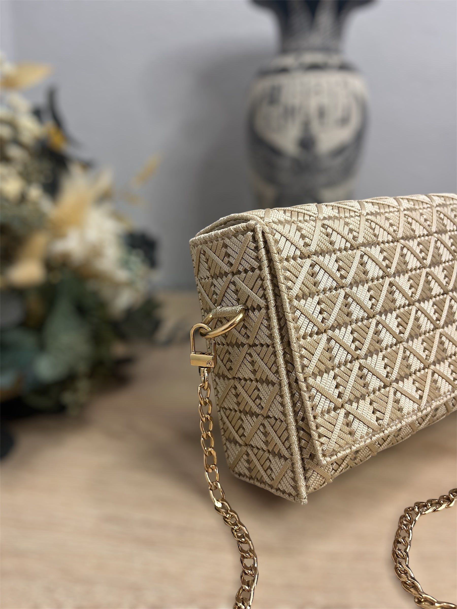 Este bolso hecho a mano rinde homenaje a Isis, la diosa egipcia de la feminidad y la protección. Su textura geométrica tejida refleja la perfección de los símbolos ancestrales, mientras que la cadena dorada aporta un toque de sofisticación y poder, evocando la realeza del antiguo Egipto.