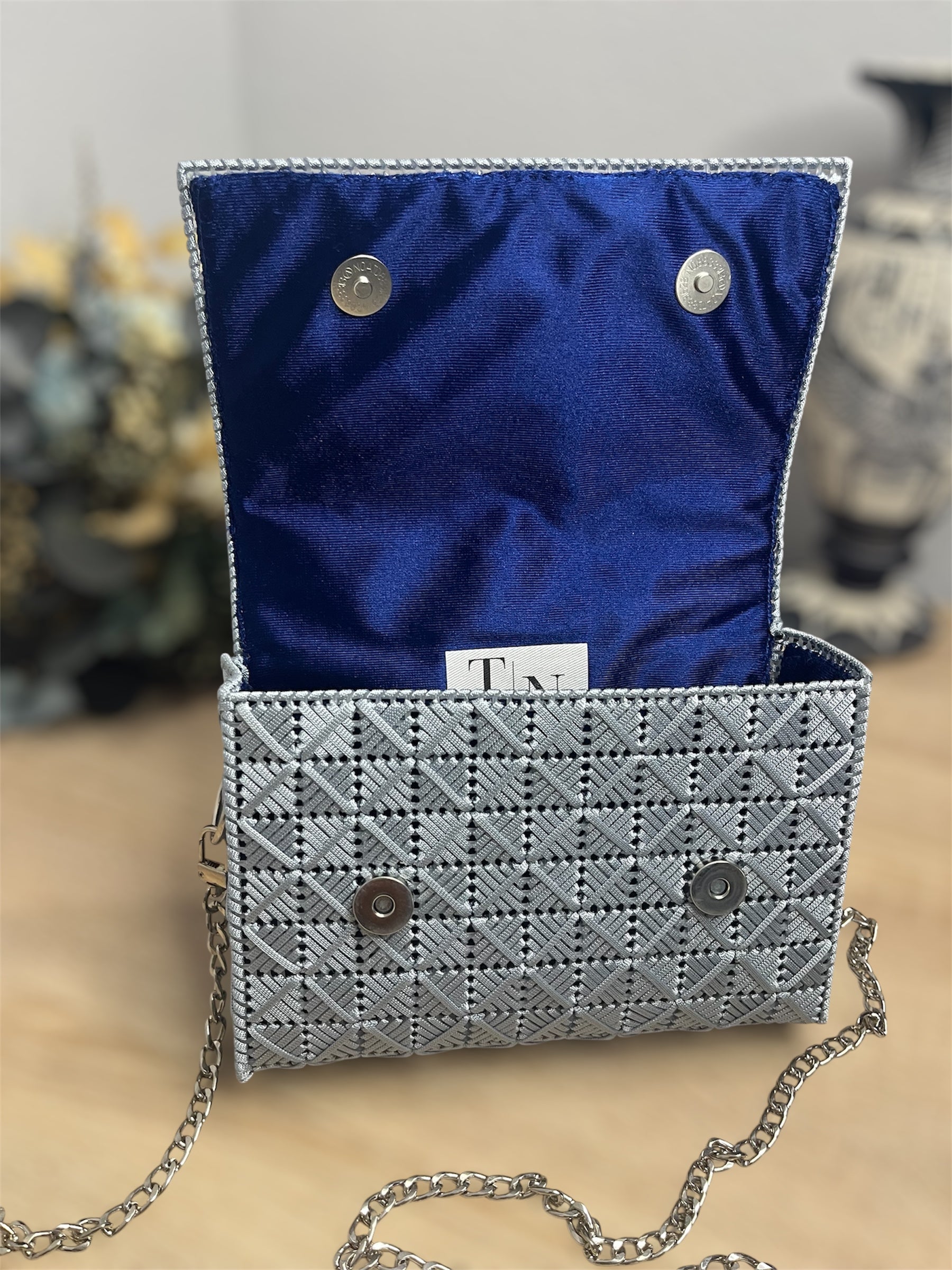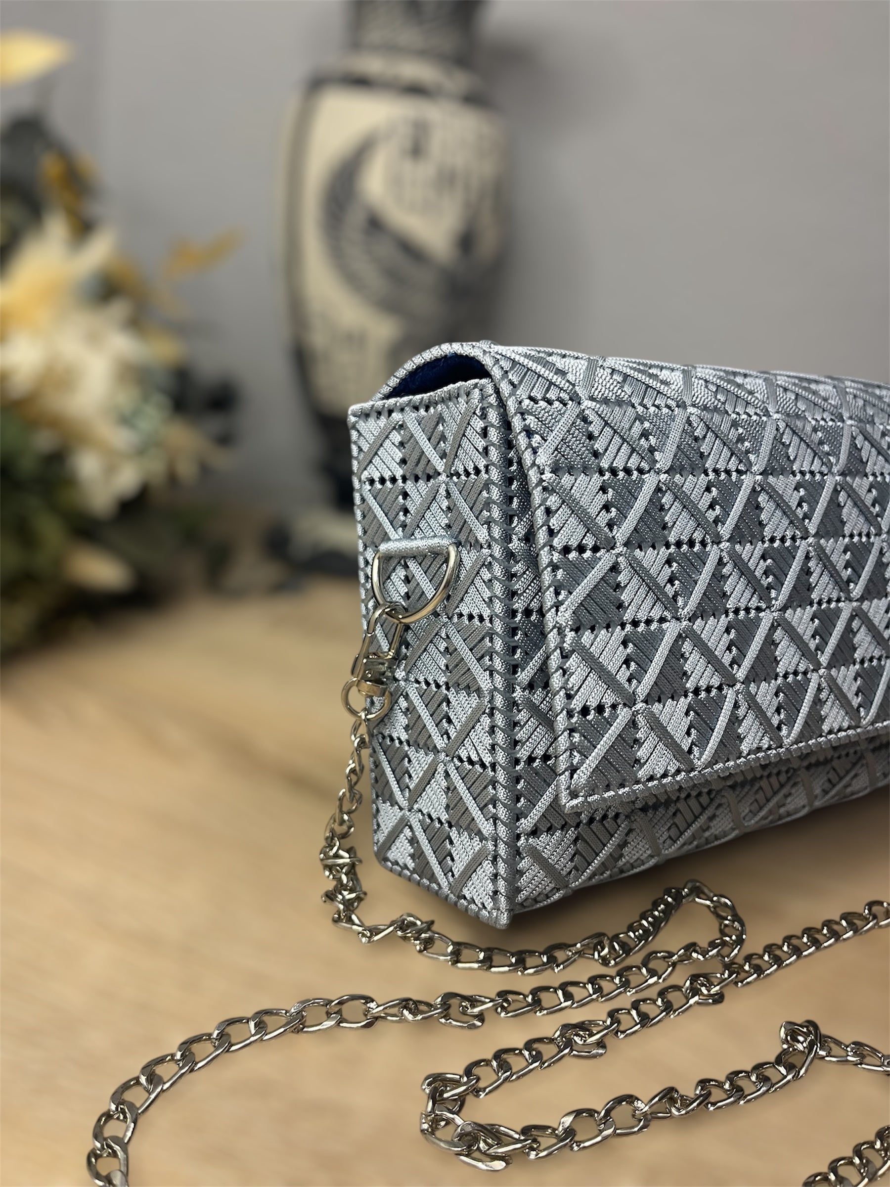 Este bolso hecho a mano rinde homenaje a Isis, la diosa egipcia de la feminidad y la protección. Su textura geométrica tejida refleja la perfección de los símbolos ancestrales, mientras que la cadena plateada aporta un toque de sofisticación y poder, evocando la realeza del antiguo Egipto.
