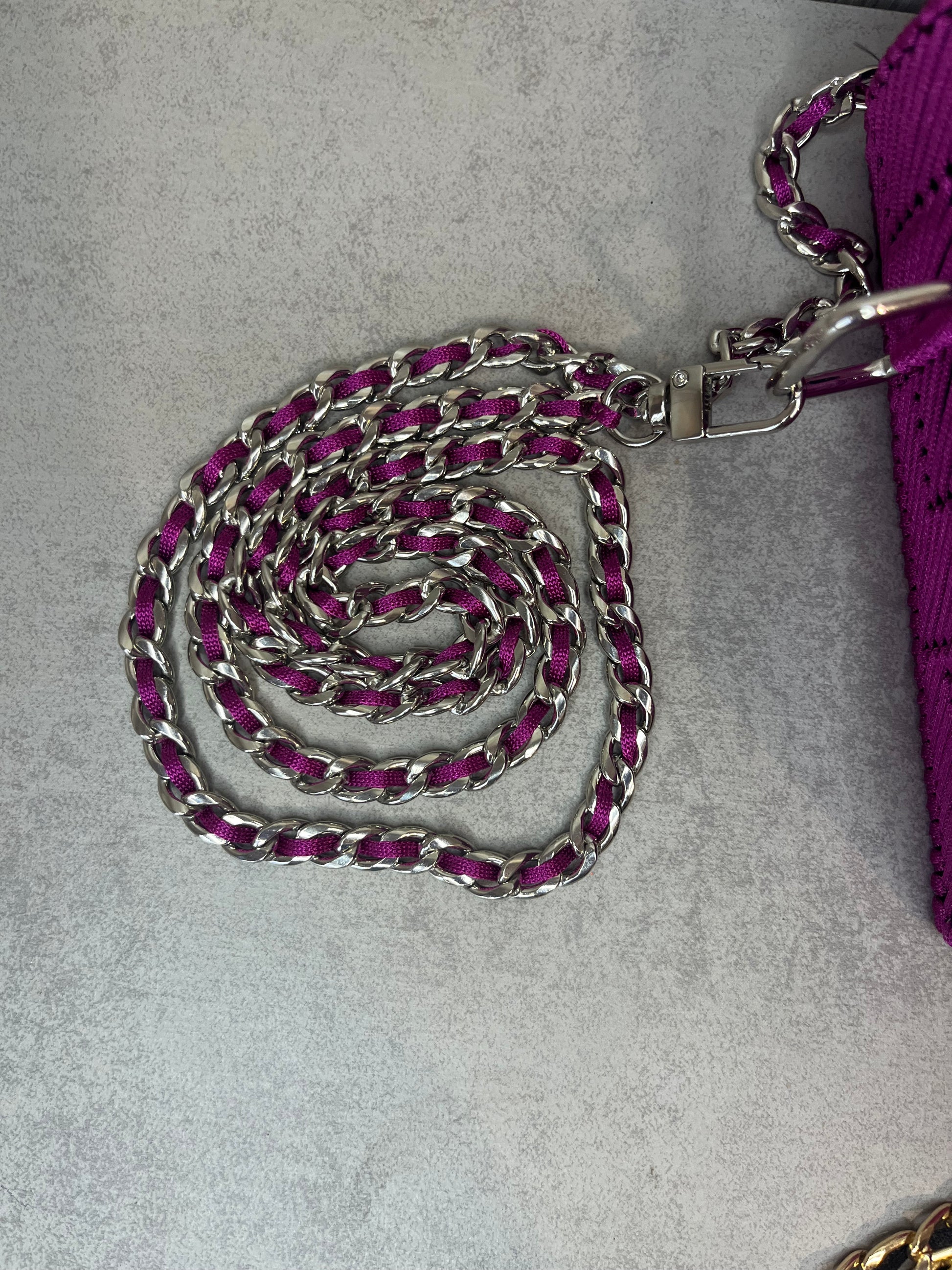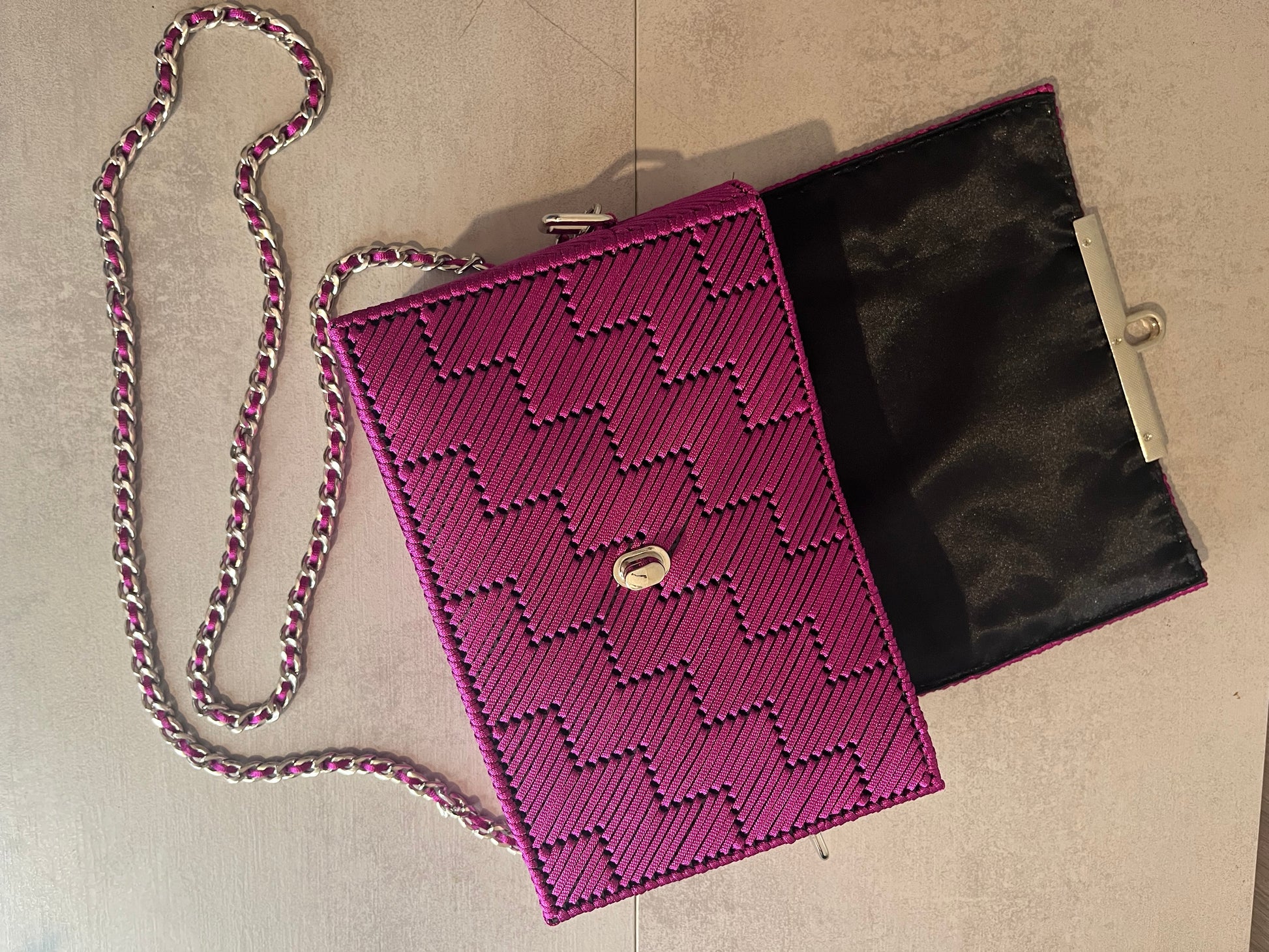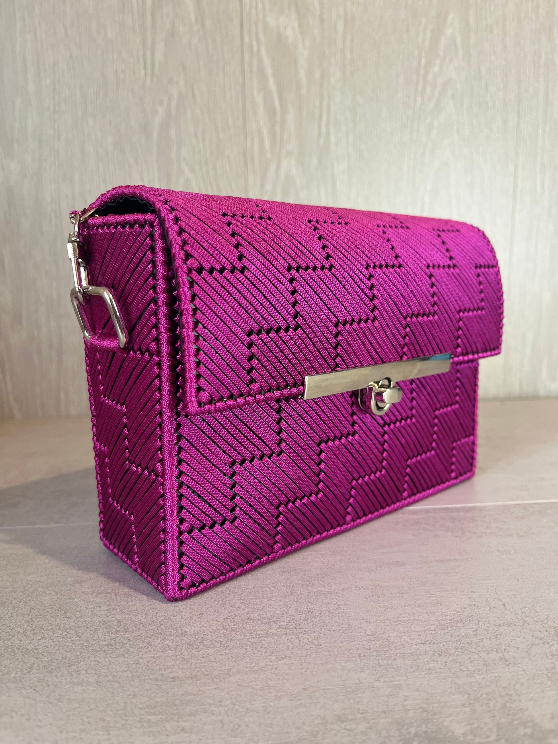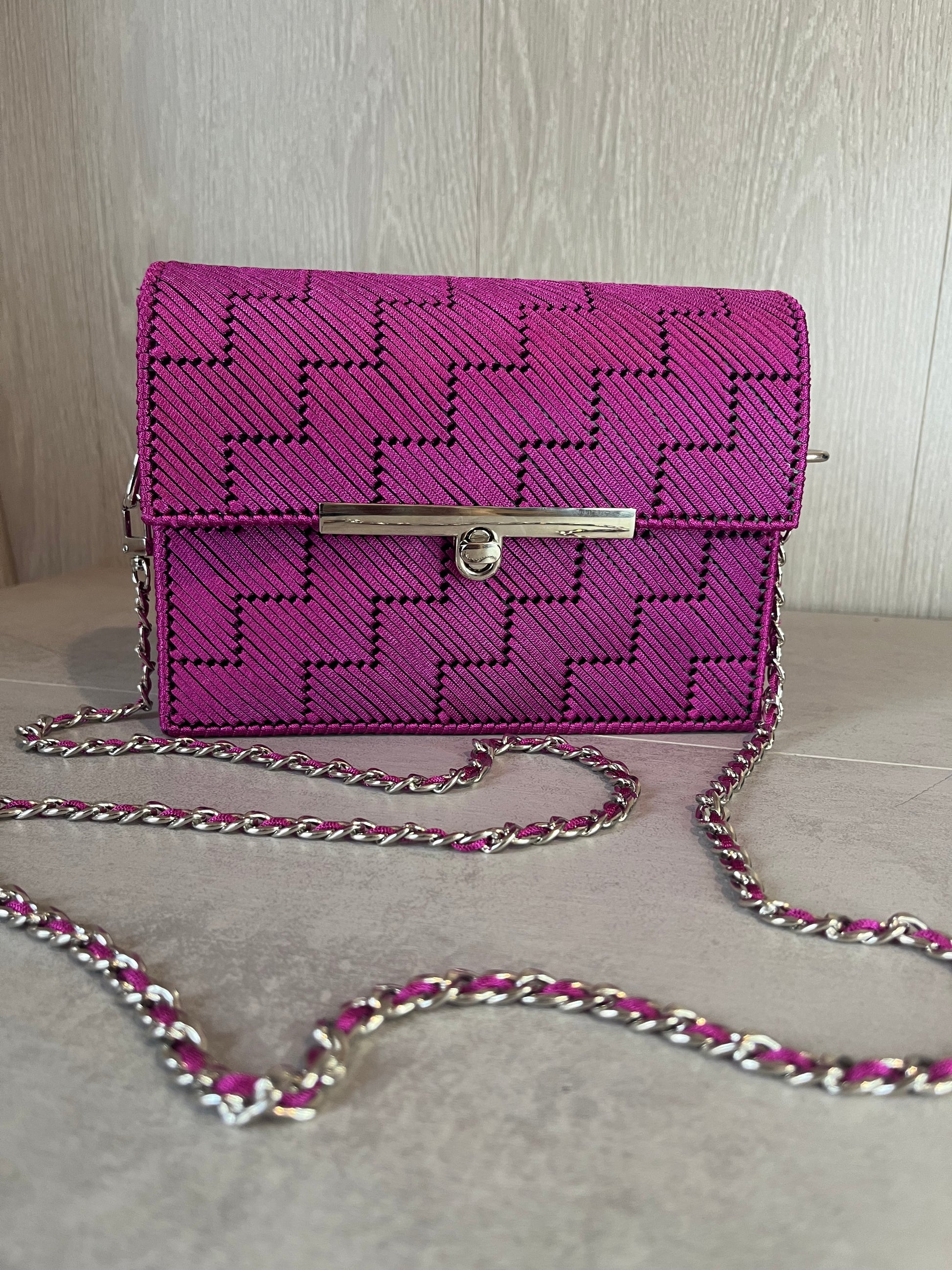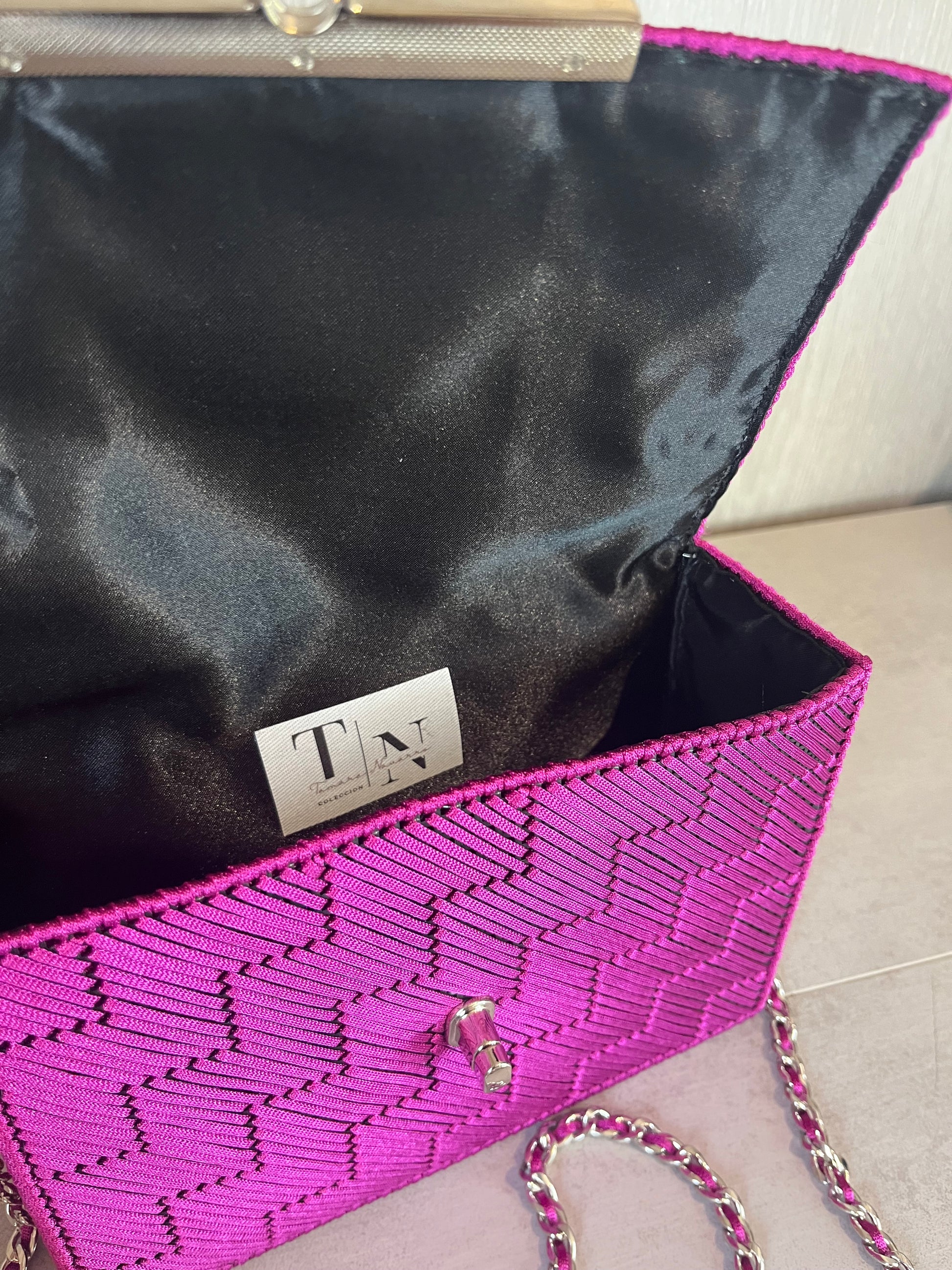 El bolso Etna se caracteriza por su diseño moderno y arquitectónico en forma de escalera, aportando energía y personalidad únicas. Su cadena plateada combina armoniosamente con el tono fucsia del bolso, creando un detalle elegante y llamativo